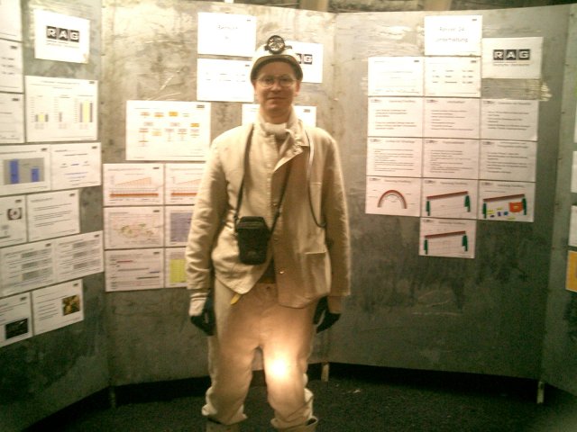 Hier stehe ich vor einer Informationstafel des Logistikreviers am Schacht Lerche, auf der wichtige Daten und Fakten für die Bergleute zu finden sind.
